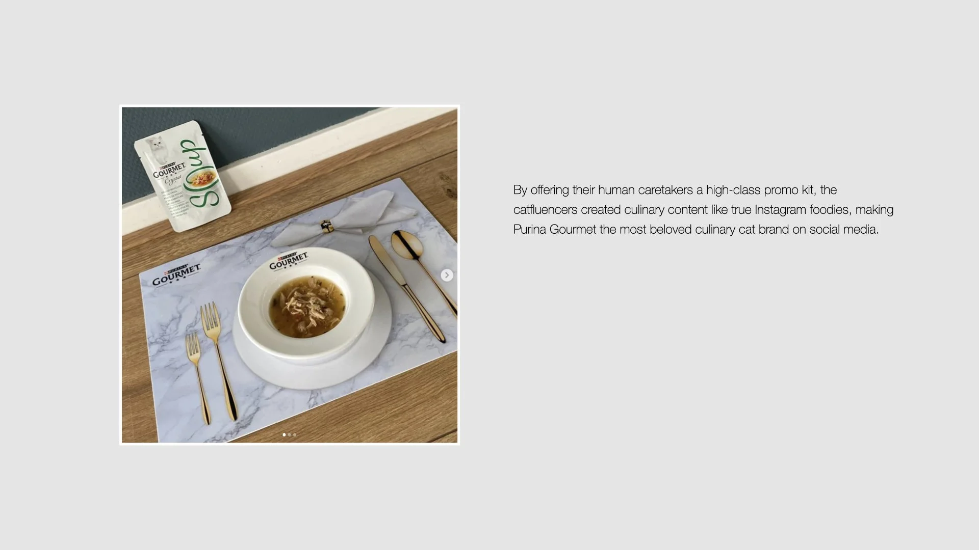 By offering their human caretakers a high-class promo kit, the catfluencers created culinary content like true Instagram foodies, making Purina Gourmet the most beloved culinary cat brand on social media.
